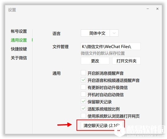 打开「设置 - 通用设置」,在通用部分有一个清空聊天记录的按钮,并且会提示大概会多大的占用空间可以清理出来。如果大家觉得一键清理了所有聊天记录太过「简单粗暴」的话,可以打开前面保存视频部分中提及的微信文件保存位置,建议手动清理 Files、Image、Video 这三个文件夹里的内容。