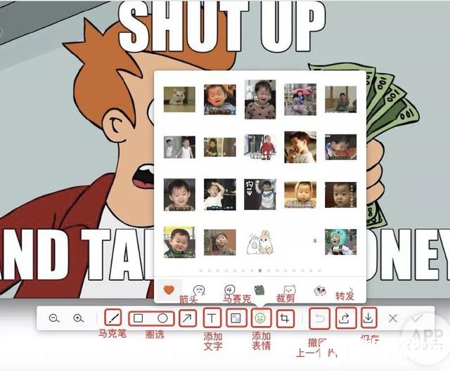 微信聊天框内置了截图功能,虽然仅能够满足区域截图,但本身内置了基本的图片编辑选项,比如箭头、画标注、添加文字,减少使用第三方图片编辑工具,微信截图的一大特色还包括了可添加收藏的表情图,工作之余增加点娱乐趣味。