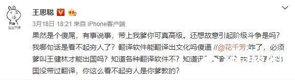 事情的起因是一位知名作家花千芳在微博发表了自己的关于对英语的看法,并表示:英语无用!国内提倡的全民学习英语就是在浪费时间,浪费财力!此事一出,立马引发了大批网友的热议!王校长看到这种说法表示不能忍。直接发微博回怼花千芳,直言表示:2019年了还有没出过国的傻X!随后,两人之间的撕逼大战不断升级,花千芳拿出王思聪爹说事,王思聪随后爆粗口,这个话题就一直待在热搜上!