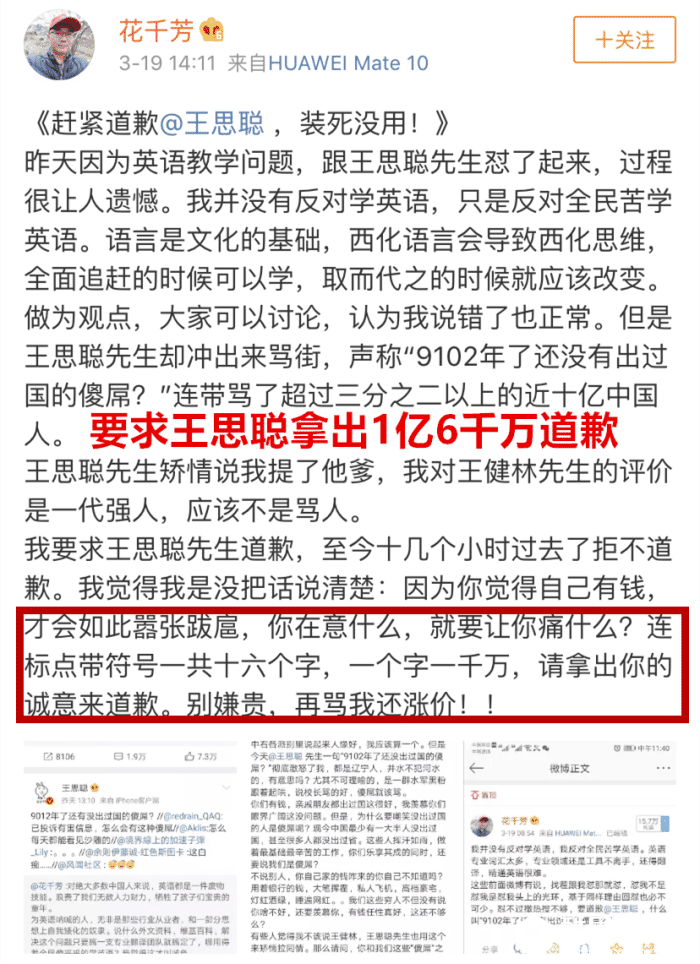 紧接着昨天下午,又置顶了一篇《赶紧道歉@王思聪 ,装死没用!》,“我要求王思聪先生道歉,至今十几个小时过去了拒不道歉。我觉得我是没把话说清楚:因为你觉得自己有钱,才会如此嚣张跋扈。”花千芳总结了事情的来龙去脉,要求王思聪为他的“脏话”道歉,一个字一千万,加上标点符号一共十六个字!也就是一共1亿6千万!如果王思聪拒不道歉,还会涨价!