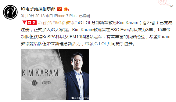 在昨天晚上IG战队官博终于宣布了新教练:前ESC Ever战队主教练Kim Karam。