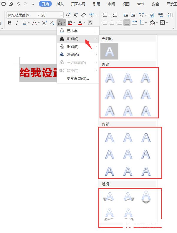 2、选中所有的内容,此教程由软件自学网首发,点击字体效果里面的阴影。就可以看到无阴影,外部,内部,透视里面很多设置好的效果。