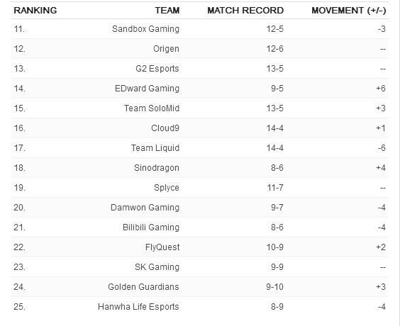 图内为第11至第25的战队排行: