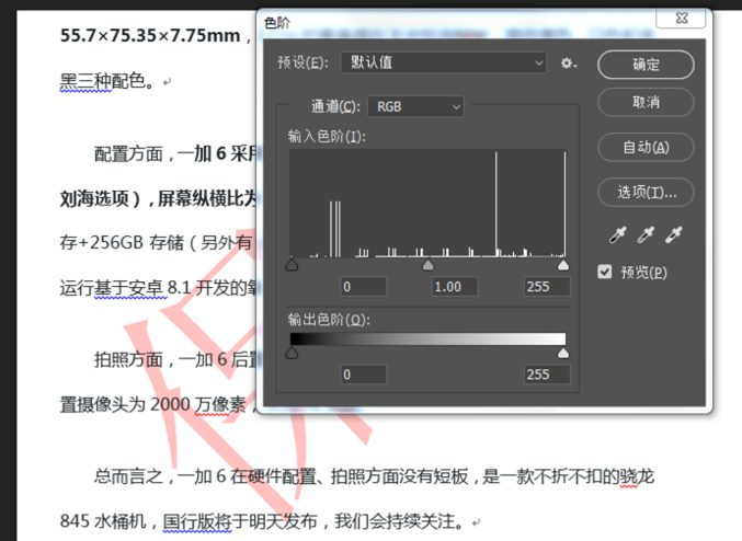 利用PS色阶工具去除图片水印还是很简单的,请注意,此方法适用于水印颜色与主图有明显区别的情况下。