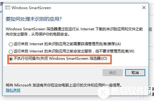 弹出窗口,勾选【不执行任何操作(关闭Windows SmartScreen筛选器)】,如图,
