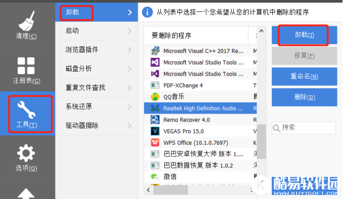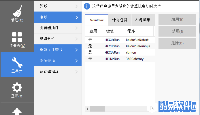 4、 除了能卸载软件之外,CCleaner还可以帮你管理启动项、注册表清理等一些可以帮助你清理电脑的功能。