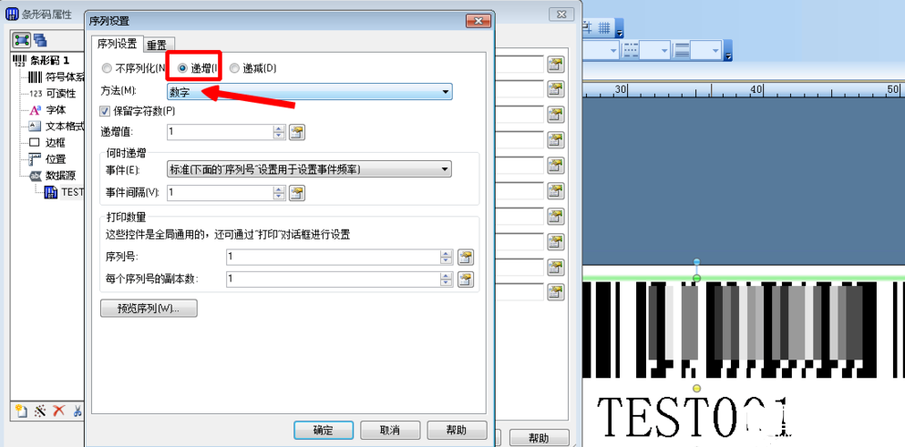 进行序列化设置,勾选【递增】,在方法中选择数字,同时勾选【保留字符数】,