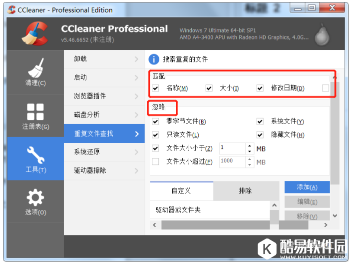 打开CCleaner软件,进入界面,点击“工具”选项,选择“重复文件查找”命令,这里会有一个列表,你可以通过匹配名称、大小、修改日期的方式来搜索文件,