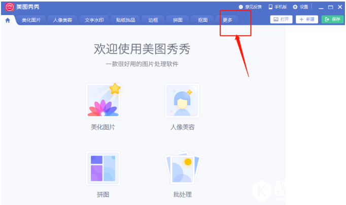 打开美图秀秀,进入主界面,点击工具栏中“更多”选项,切换到更多界面,我们可以看到“闪图”工具,如图,