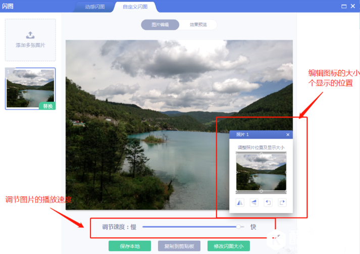 这里有“动态闪图”和“自定义闪图”,根据实际需求进行选择,小编选择的是“自定义闪图”,然后对图片位置、大小和播放速度进行调节,如图,