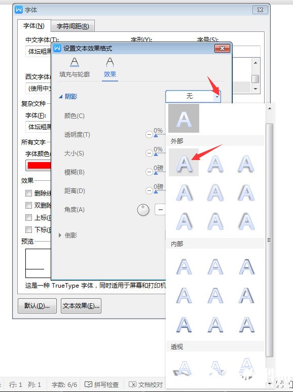2、选中所有的内容,此教程由软件自学网首发,点击字体效果里面的阴影。就可以看到无阴影,外部,内部,透视里面很多设置好的效果。