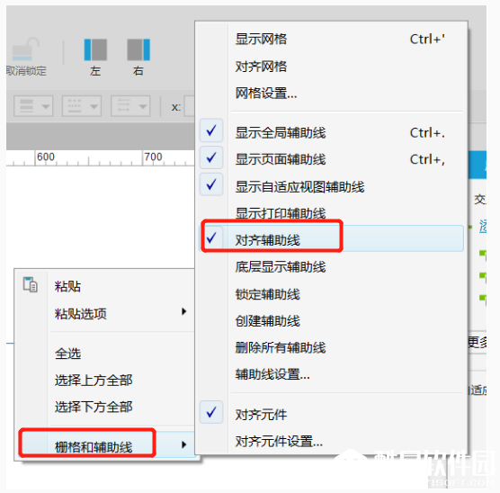 创建矩形成功,鼠标右击页面,弹出对话框,点击“栅格和辅助线”——“对齐辅助线”,