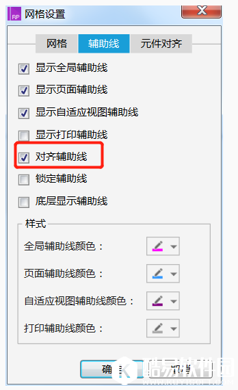 另外,我们也可以点击“网格设置”——“辅助线”——“对齐辅助线”,单击确定,