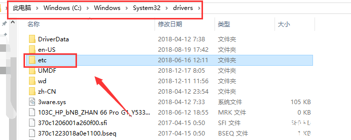 根据路径:C:WindowsSystem32drivers,找到并点击etc文件夹,如图,