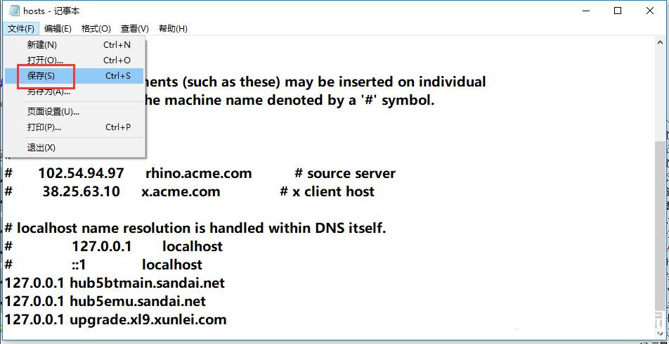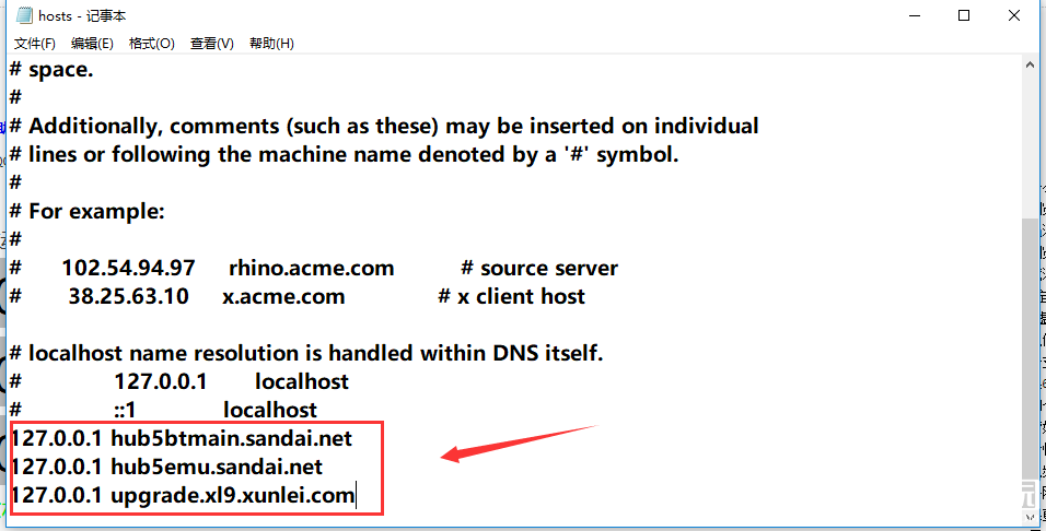 在记事本中输入【127.0.0.1 hub5btmain.sandai.net】、【127.0.0.1 hub5emu.sandai.net】、【127.0.0.1 upgrade.xl9.xunlei.com】,记住要在最后一行输入,