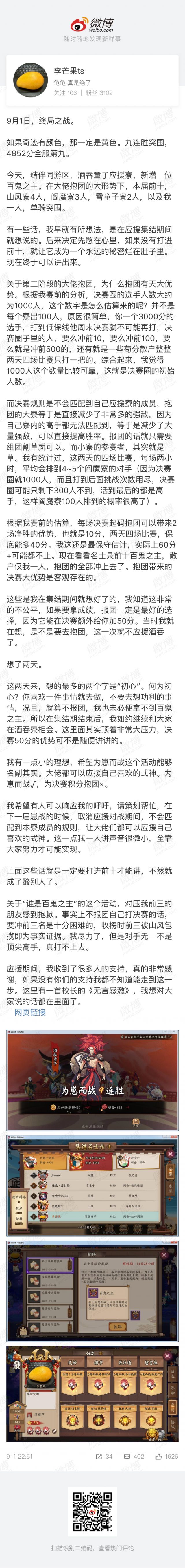 李芒果虽然招财速度不是特别顶尖吧,但是散件速度确实强的爆炸,在现在这个不怎么吃招财速度的版本(琴师大蛇),加上崽战改成了遮ID的模式,李芒果大佬的速度优势就被放大了很多。这次崽战也是拿下了百鬼之主的位置。随后更是微博发表小作为,抨击本届崽战的抱团现象,前百拉下来一堆的山风阎魔蟹姬化鲸。