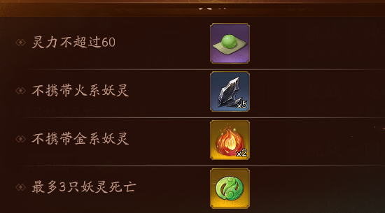 金破条件,惯例的妖灵不能带强克制系,然后死亡妖灵不超过3只,灵力限制就不管了,还不如把这条换成不带日系比较有意思。