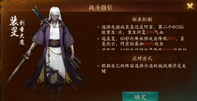 boss又是裴旻和阿蛮这对苦命鸳鸯,这里和哪个挑战本类似,需要玩家选择先挑战的目标,根据选择的不同会带来不同的影响,同时先阵亡的boss会给下一个出场的boss加不同buff。