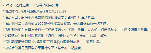中秋活动苍月之辉,和去年的中秋活动类似,累积7天试胆大会达到100勇气值,活动一个皮肤,不过吸血姬最近皮肤是不是太多了点?当初全狰教一姐皮肤,地鬼一姐没皮肤,彻底退群了皮肤反而多了?这就是所谓的死者为大?