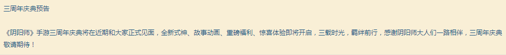 其他更新,无,只有一个三周年庆典预告,已经正式服插画商店会在9月20日也就是下下周五更新,也就是说这天会上线新式神和三周年活动。按照以往的惯例,起码有一个以上的新式神以及一个未收录,各位你们准备好了吗?