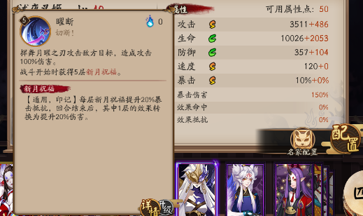 泷夜叉姬普攻,有特效,这次不把被动写进二技能或者三技能了,而是写进了普攻里。泷夜叉姬开场自带5层新月祝福,每层祝福增加20%的暴击抵抗。5层就是100的暴击抵抗,即对面如果是暴击100%的式神,打在茶几身上就只有白字。但是101%暴以上的式神,虽然几率极低,但是是有暴击的。之后夜叉姬每行动一回合,一层暴击免疫就会转变为20%的伤害提升效果。