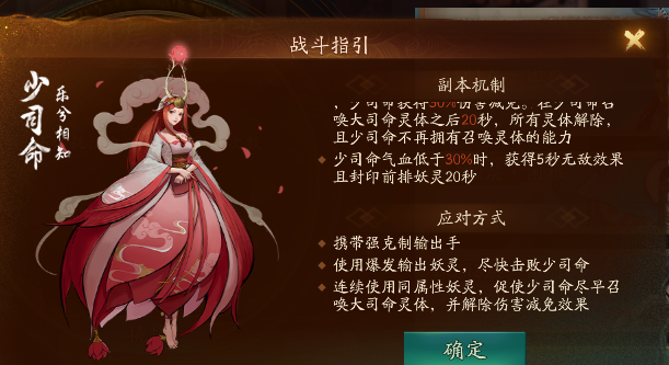 注意事项,由于boss是月系,加上这个阵容不是双鹿蜀,大司命的回气不算特别顺畅,boss要狂暴前要记得让大司命留气抗大。河伯出来前无脑放大,河伯出来后这货伤害很高,因此我们这里不要大司命不要放技能了,天禄有大就开,保证大司命满血,之后全程躲技能,boss狂暴用满血大司命抗一下,不会死。灵体消失后继续输出。
