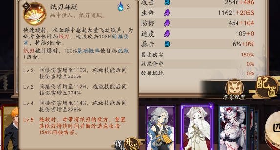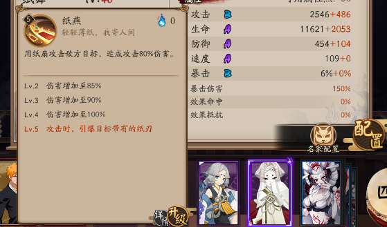 纸舞大招,三火技能,最少可以变为1火。为群体间接伤害,对敌方群体附加持续三回合的纸刃,同时造成纸舞攻击114%的间接伤害,然而这个B+的攻击面板实在是,说实话这复古的面板,除了开服式神之外真的很少见了。同时带有纸刃的单位回合结束后,受到纸舞攻击228%的间接伤害。
