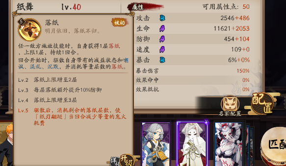 纸舞被动,敌方每次施放技能时,自身可以获得一层落纸效果,上限三层,持续三回合,每层落纸提升纸舞10%的防御和10%的攻击。