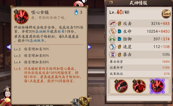 不过相比起凤凰火山童,络新妇控制是主动效果而不是被动效果。虽然是基础概率,但是络新妇通过提升自身的速度,拉大和对方的速度差,可以提升对低速目标的控制概率。