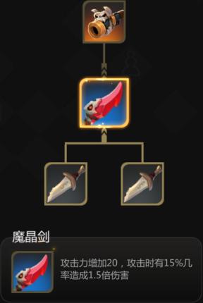 紧随重棍之后的是魔晶剑,魔晶剑作为合成龙骨大炮的前置装备,本身的属性其实并不出彩,20点攻击力与15%概率的1.5倍暴击,实际效果不像看起来那样优秀。15%概率造成1.5倍暴击,等同于15%概率提升50%输出,换算下来等于7.5%的攻击伤害加成,在中期的话也就相当于约10-15点面板的提升总加成可能还不如合成前的两把断剑高。因此大家在得到两把断剑时可以暂时先不合成,等到能够合成龙骨大炮时再一并进行合成。推荐指数三星。