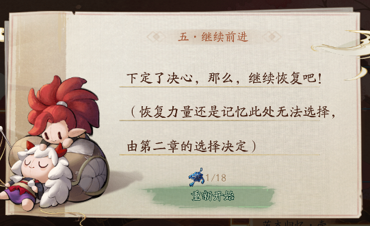 重置第五章剧情的时候可以看到这个提示,这里我们只能恢复前两条线的力量,而无法恢复下面两条线的记忆。说是由第二章的选择做决定,然后返回第二章剧情。