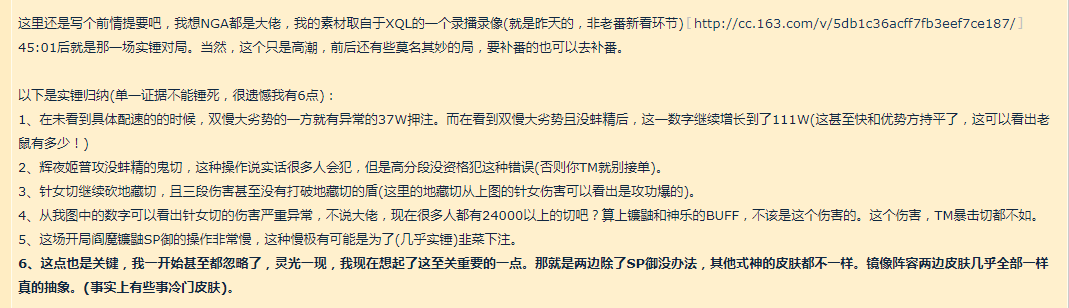 然而实际情况是前十分段的鬼切两次大招杀不死一个鬼切,并且之前辉夜平A鬼切打出了地藏盾。正常的情况应该是鬼切大招一个辉夜之外的辅助压下血线,然后神乐疾风击杀地藏,就算没有这个操作,面对一个没蚌精保护的切其实也无所谓。之后四下皆你的鬼切反杀,而这个鬼切从伤害数字来看是一个纯输出切。