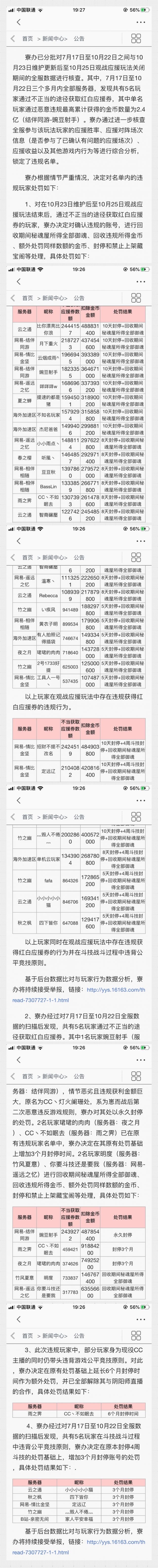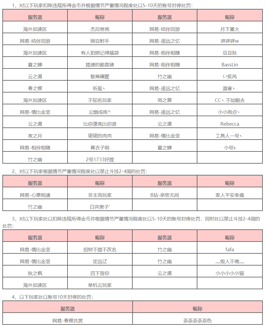 相比于第一次处罚结果,这次处罚公告涉及的玩家更多,处理力度更大,并且也处理说明也更加详细。