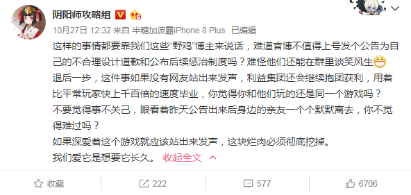 阴阳师相关粉丝数最多的账号@阴阳师攻略组也,平时可以看到几乎是被官方收编了,这回下场加大力度,通过个人影响不断个官方施压