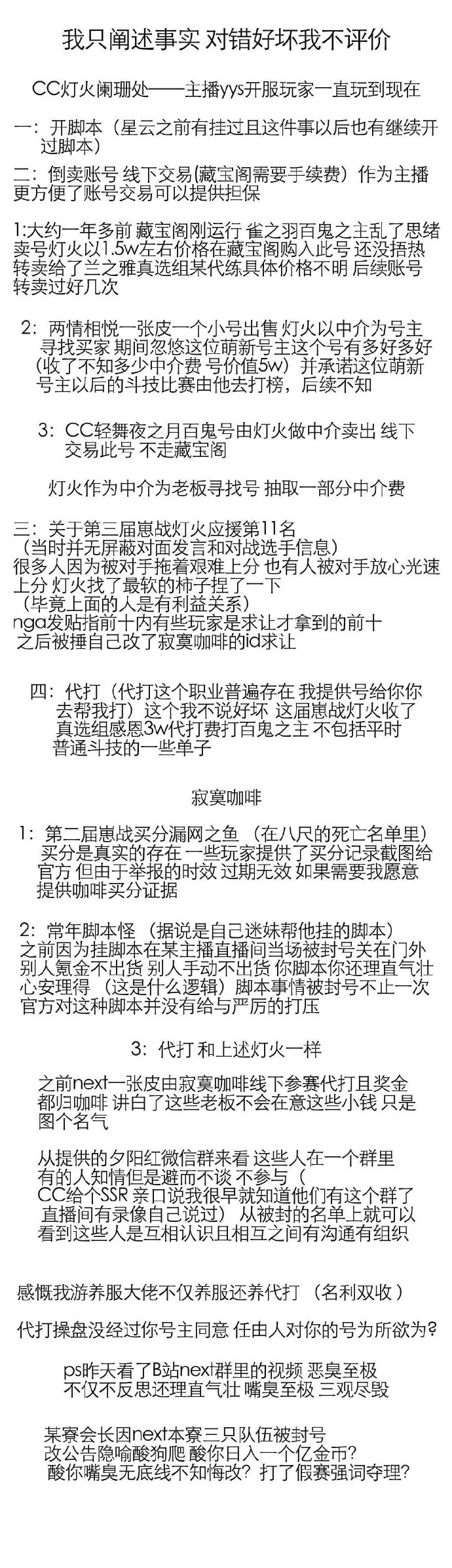 另一位知名玩家CC主播白衣子明风评被害,自己借号改自己的ID参加next比赛,结果因为涉及操盘被强行退赛不说,还被不少人以为是本人不幸躺枪。