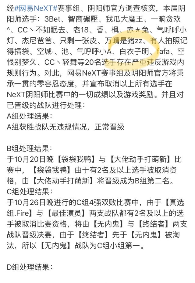 在10月26日的周六当晚,官方发布了应援斗技演员的第一次处罚结果,同时对于next赛事中一组有两名以上涉事玩家的队伍也做了退赛处理,然而就处理的力度来看,真的就是罚酒三杯不疼不痒。