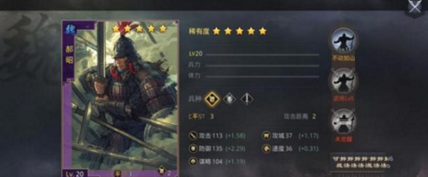 用法:郝昭作为超形队的核心之一,本身拥有着率土之滨中最肉的身板,同时也拥有着不错的输出能力,技能为行动时净化控制效果,自身防御属性及谋略属性提升。作为中军位置的郝昭承担着超形队的输出以及坦克的重任,郝昭练度提升之后整个队伍的强度都能获得提升。