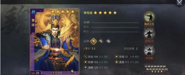 用法:曹操作为队伍的前锋位置,本身便拥有着游戏中数一数二的卡面属性,不论是攻防还是速度与谋略都属于上等水准。其自身拥有的魏武之世的战法能够开局就直接给敌方上debuff,同时增加己方全军攻击距离,属于相当强力的前锋武将。
