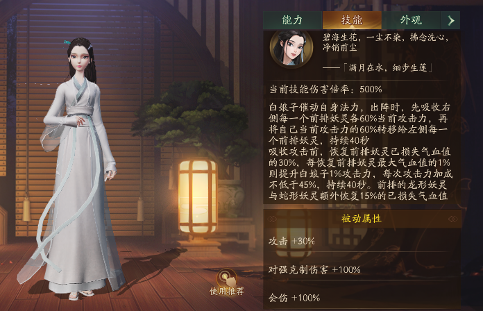目前就两者的输出能力来看,其实是持平的,都没有差太多,但是白娘子的特殊之处在于这货除了是一个输出,也能当一个拐,尤其是对于攻击面板天残的输出来说提升极大。