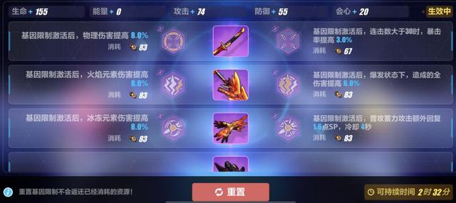 在神之键阁界面,点击基因限制按钮即可进入到提供特殊技能加成的界面,当解锁了相关属性技能后,即可在此界面,每一行选择一项加成,目前3.6版本最多可以同时开启4项加成。