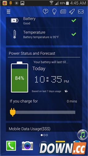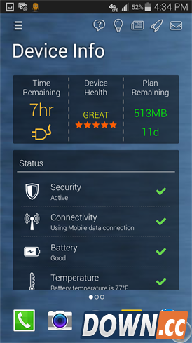 另一个非常强大的功能是:点击右上方那个小怪物,屏幕会立刻显示你手机所有实用信息,包括“电池待机情况”、“手机健康”和“流量数据使用报告”。
