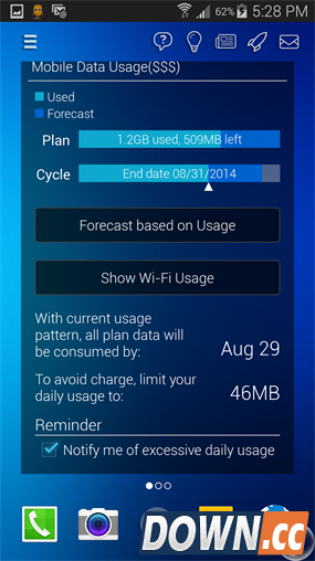 此外,“流量数据使用”也值得一提。它会告诉像我这样马大哈的人: 2 GB 或多少 GB 的包月套餐,我目前已经使用 1.2 GB,然后按我以前使用流量情况,大概 8 月29 日就会超流量,所以我最好每天限制流量在 46MB 左右。