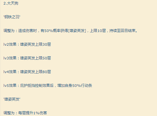 现在大天狗也变成了一个非一波型的的慢热型输出,雄姿英发不再是开场生成了,而是在大天狗造成伤害后,有50%的概率(酒吞:嘻嘻嘻)获得一层雄姿英发的buff,并且提升1%的伤害,雄姿英发上限80层。