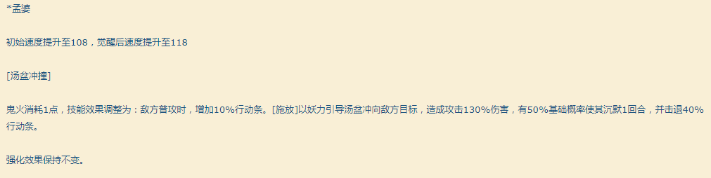 二技能汤盆冲撞鬼火消耗不变,还是一火,技能效果调整为敌方普攻时孟婆增加10%的行动条,释放时对单体目标造成伤害,并有50的基础概率沉默其1回合并击退40%的行动条。这个改动是为了打哪种体系的就不用说了。不知火尤其是化鲸体系影响绝对是最大的,毕竟沉默对普攻体系是其实完全没影响,那么我要是退你的条呢?众所周知,妈宝男不仅肉伤害高还跑的飞快。那我要是不仅沉默你还让你没法出手呢?要值得注意的是一次普攻可以拉孟婆10%的条,不知火带来的二段普攻算两次。你伤害爆炸?那我让你没有回合总可以吧。