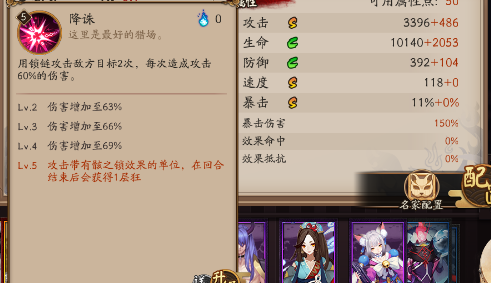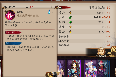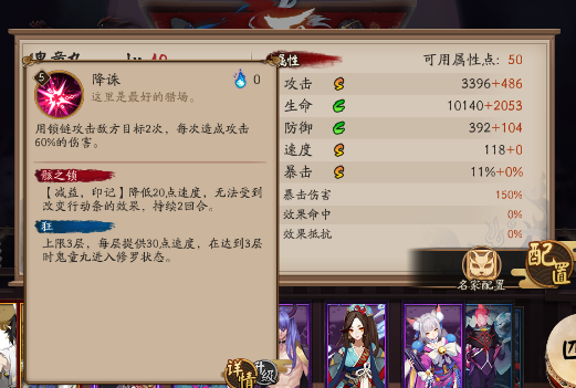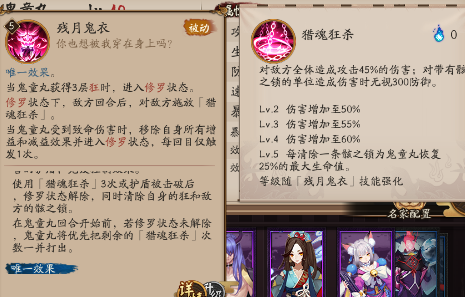 如果鬼童丸攻击的是带有骸之锁的敌方目标,则鬼童丸在回合结束后获得一层“狂”状态,上限3层,每层增加鬼童丸30点 速度,达到3层时进入修罗状态