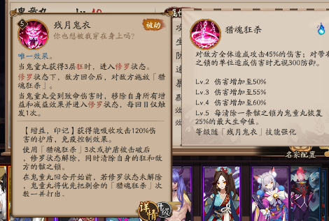 在鬼童丸回合开始前,如果处在修罗状态下,则将优先打出三次猎魂狂杀,猎魂狂杀对敌方全体造成60%的伤害,对于有骸之锁的目标,无视起300防御。猎魂狂杀打完,鬼童丸修罗状态解除,敌方骸之锁移除,那么此时每移除一条骸之锁,则为鬼童丸恢复25%的生命值。