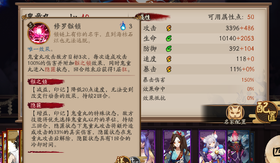 隐匿状态将在鬼童丸攻击后解除,有一回合CD,在此状态下,鬼童丸攻击将附加自身33%的真实伤害。