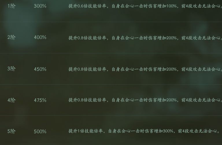 五阶沉香技能效果,技能倍率提升一倍,也就是750技能倍率,会心伤害增加300%,然后前四段无法会心。这里要注意,沉香的技能段数只有5段,也就是走会心流的话,只有最后一段才能打出伤害。