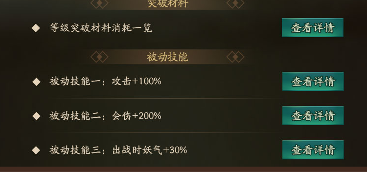 被动效果,出场妖气+30%,攻击翻倍,70级沉香的攻击是5950,翻倍的话将近1W2了,80级甚至可以达到W4。对于SR来说,真的很有牌面了。