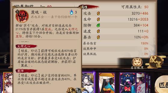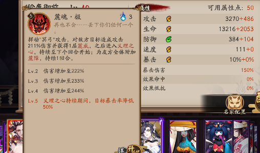 二技能三火,也就是这又是一个双技能式神。三火单体攻击,并使自己活得一层麓威,麓威上限十层,每层提升铃鹿御前20%的攻击和防御,然后进入一回合的义理之心状态,义理之心效果等于铃鹿御前变为兵俑,可以强行让敌方只能进行铃鹿御前进行攻击,并且了铃鹿御前或者一个可以吸收自身攻击80%的护盾,护盾最多承受4次攻击。没猜错的话,和其他护盾式神一样,吃暴击暴伤。如果护盾被打破,义理之心提前解除,过这里推测应该只有单体攻击才有用,群体AOE应该无效,加上可以用技能攻击而不是普攻,并且兵俑的嘲讽还是差了不少、